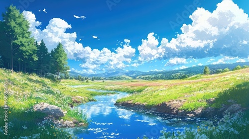 Serene anime-style summer landscape with a clear stream, fields, and fluffy clouds under a bright blue sky