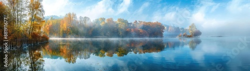 Serene autumn lake with colorful foliage, reflecting trees, blue sky, and misty horizon. Perfect for nature and landscape photography.