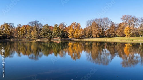 Serene Autumn Reflections in a Calm Lake Surrounded by Trees