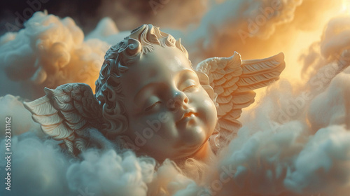 Serene Baby Angel Sleeping on Clouds: Soft, Dreamy, Celestial Artwork. Serene Sleeping Angel Figurine on Clouds, Peaceful Heavenly Scene, White Statuette, Soft Light