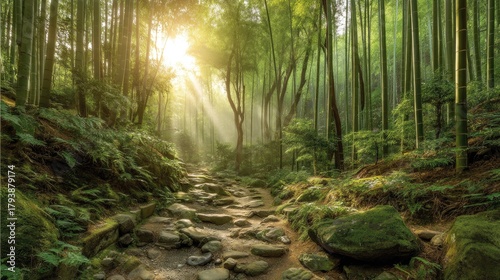 bamboo, forest, sunlight, greenery, landscape, nature, peaceful, calmness, rock, tree, wilderness, outdoors, serene, hiking, path, tranquil scene, natural beauty, foliage, vibrant, scenic, environment, morning, mist, shadow, beauty, environmentally friendly, calm, scenic view, fresh air, adventure, exploration, zen, relaxation, biodiversity, ecosystem, forest floor