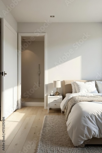 Serene Bedroom Interior Design with Minimalist Decor and Ensuite Shower