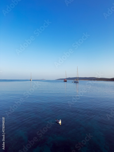 Serene Blue Waters with Sailboats and a Floating Seagull