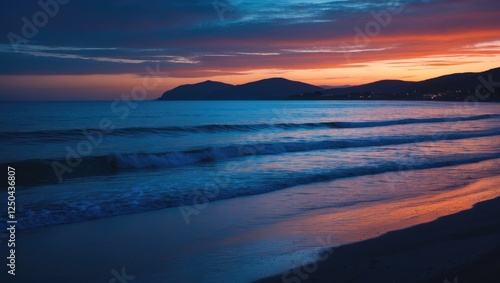 Serene coastal sunset with deep blue and orange hues reflecting over calm ocean waves and silhouetted hills on the horizon.