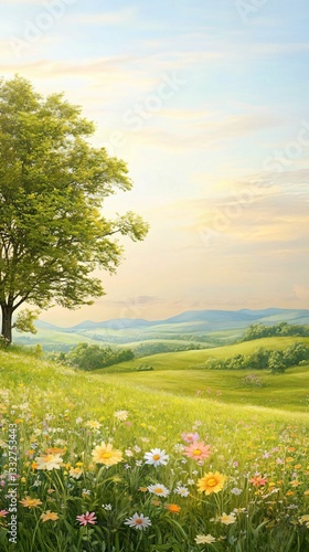 Serene Countryside Landscape with Vibrant Flowers and Green Hills