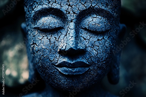 Serene Cracked Blue Buddha Face Meditation Peace Spirituality Relaxation Tranquility Ancient