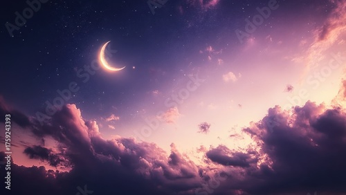 Serene crescent moon glows brightly amidst vibrant twilight clouds and a star-dusted night sky, evoking peace and wonder