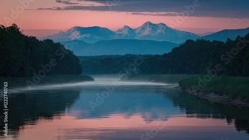 dawn, landscape, serene, river, water, pink, blue, hue, tree, green, mountain, snowy, distant, nature, calmness, scenery, peaceful, sky, morning, light, calm, beauty, picturesque, idylli, summer, wilderness, view, closeup, natural, environment, vibrant, quiet, soft, atmospheric, sunlight, horizon, mist, panorama, scenic, fresh, daylight, relaxation, stillness, rural, travel
