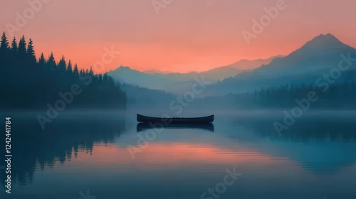 Serene Dawn Reflections Over Calm Lake with Canoe and Mountains