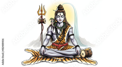 Serene depiction of Lord Shiva meditating in natural setting with symbolic
