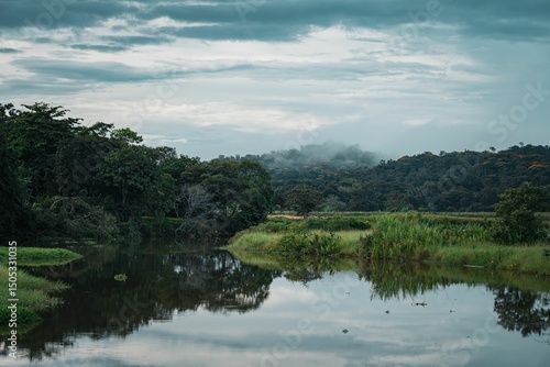 landscape, forest, river, nature, serene, tranquil, cloudy, sky, greenery, water, peaceful, wilderness, scenic, lush, environment, calm, tree, foliage, natural, ecosystem, habitat, untouched, rural, countryside, mist