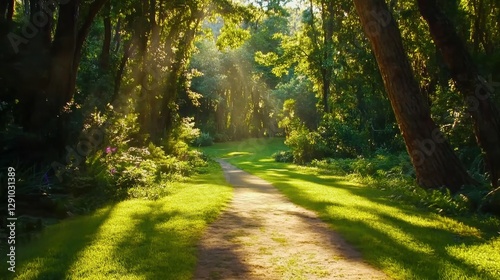 Serene forest path illuminated by gentle sunlight creating a peaceful atmosphere in nature