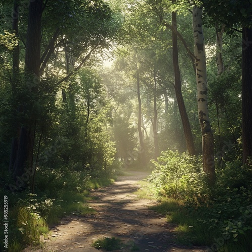 Serene Forest Pathway: Lush Greenery and Dappled Sunlight