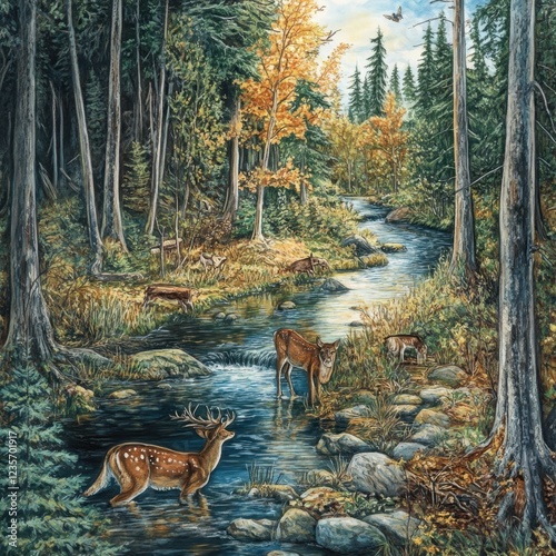 Serene Forest Scene with Deer by a Tranquil Stream Surrounded by Nature