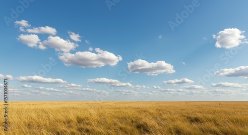 Serene Golden Grassland Under a Blue Sky with Fluffy Clouds