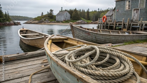 Serene Harbor Scene with Wooden Boats and Rope on Dockside