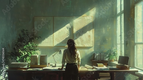 home office, sunlight, window, contemplation, woman, serene, peaceful, interior, room, natural light, shadow, relaxation, desk, computer, modern, houseplant, indoor, lifestyle, freelance, solitude, calm, thinking, professional, backview, residential, decor, frame, warm light, morning, stillness, workstation, productivity, technology, monitor, keyboard, mouse, lamp, comfort, roomy, creative, glasses, sharpened, task