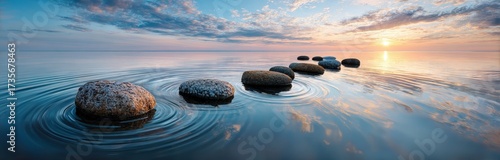 Serene Horizon Scene With Stones Arranged in Line Reflecting Sunlight Over Calm Water