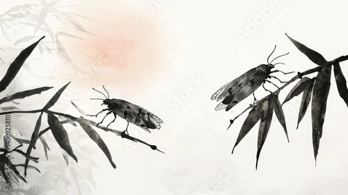 insect, bamboo, leaf, painting, ink, laundered, art, nature, serene, calm, tranquil, peaceful, zen, minimalist, japanese, chinese, oriental, traditional, artistic, elegant, graceful, black, white, grey, monochrome, tree branch, plant, wildlife, fauna, illustration, design, graphic, image, artwork, picture, drawing, vignetting, watercolor