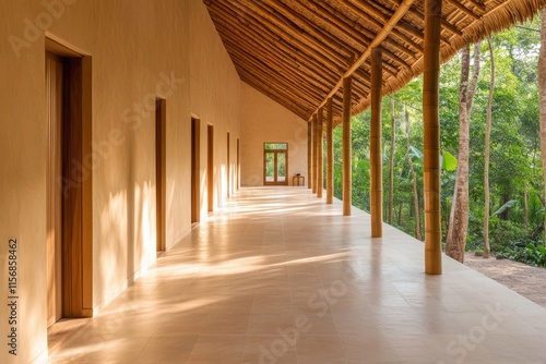 Serene Interior of an Eco-Friendly Lodge Surrounded by Lush Greenery Featuring High Ceilings, Wooden Beams, and Natural Light Illuminating the Spacious Hallway