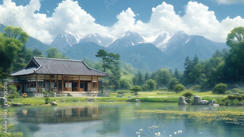 house, japanese, serene, mountain, lake, duck pond, water, tree, green, forest, sky, cloud, peaceful, tranquil, calm, nature, scenery, landscape, view, beautiful, majestic, idylli, summer, sunny, day, wood, stone, zen, garden, plant, flower, quiet, stillness, serenity, atmosphere, mood, ambience, environment