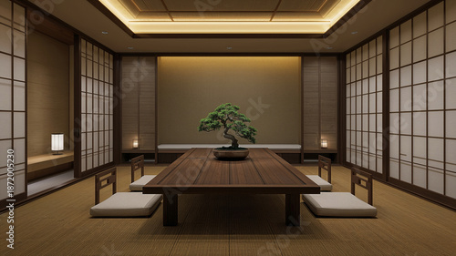 Serene Japanese Style Room Interior with Traditional Tatami Mat and Bonsai Tree