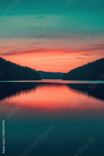 Serene lake at sunset, reflecting vibrant colors in the water.