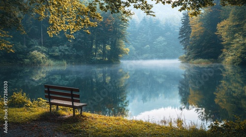 Serene Lakeside Bench with Autumnal Mist and Reflections