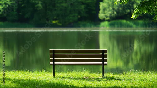 serene lakeside scene featuring wooden bench surrounded by lush greenery, perfect for relaxation