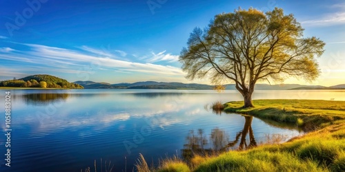 Serene Lakeside Scene with Bare Tree Silhouette Against Blue Sky - Tranquil Shoreline Beauty in Nature's Calmness