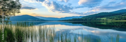 lake, sunset, mountain, reflections, water, nature, landscape, calmness, serene, scenery, cloud, ripple, sky, grass, peaceful, evening, summer, horizon, wood, scenic, blue, calm, flora, wildlife, sunlight, beautiful, environment, leisure, view, panoramic, relaxation, vacation, travel, exploration, natural, beauty, countryside, rural, waterway, serenity, generative, ai
