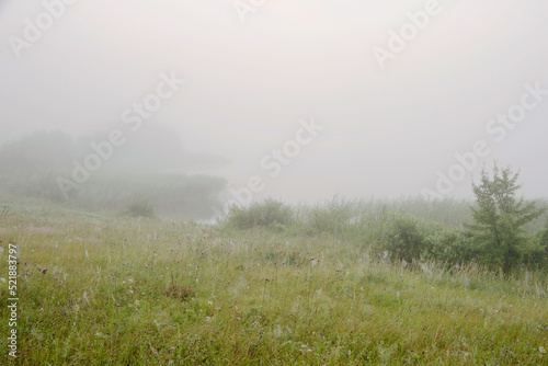 Serene landscape with a lake in the fog