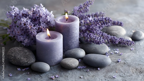 lavandula, candle, stone, spa, relaxation, calmness, well-being, aromatherapy, purple, floral, nature, balance, meditation, peace, calm, serenity, zen, wellness, therapy, fragrance, scent, light, warmth, texture, surface, grey, smooth, arrangement, closeup, shot, sprig, element, composition, sharpened, atmosphere, soothing, gentle, mindfulness, healing, comfort, harmony, still, life, decorative, elegant, artistic, beautiful, natural, organic