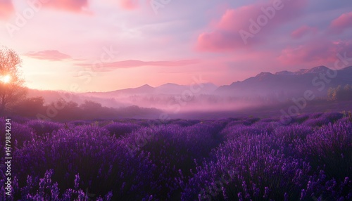 Serene lavender field at sunrise with misty mountains.