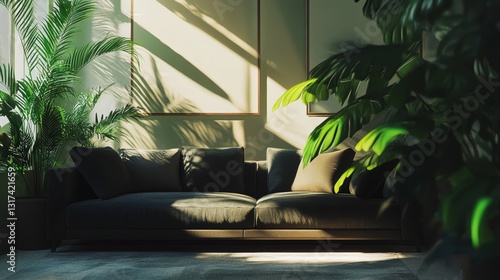 living room, sofa, couch, green plant, houseplant, palm tree, sunlight, sunbeam, shadow, natural light, home decor, interior design, calm, peaceful, serene, relaxing, tranquil, cosy, comfortable, luxury, elegance, stylish, sophisticated, apartment, condo, room, furniture, cushion, pillow, green, dark green, grey, beige, window, bright, light, shadow play, flora, botanical, greenery