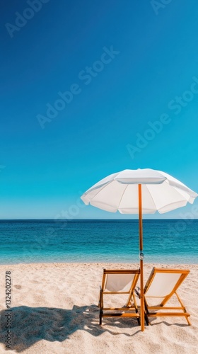 Serene Minimalist Beach Escape Luxury Resort Wellness Experience with Pristine White Beach Umbrella and Sustainable Wooden Loungers - Elevated Coastal Tranquility