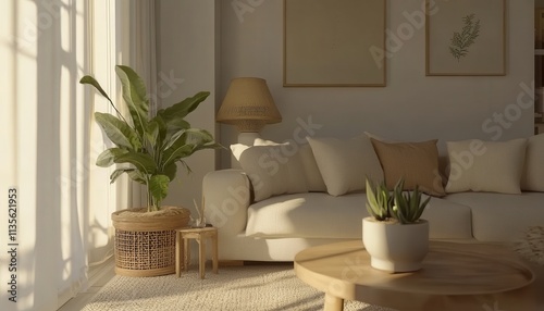 Serene Minimalist Living Room Decor: Sunlit Interior with Neutral Tones and Lush Greenery