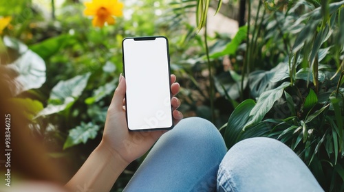 Serene Moment: Person Sitting in Garden and Using Mobile Phone with White Screen