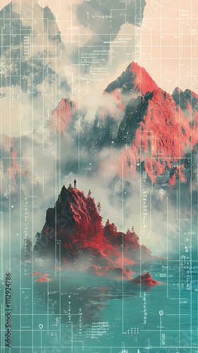 Serene mountain illustration blending pyrography details and digital art techniques, perfect for creating an otherworldly and atmospheric visual.