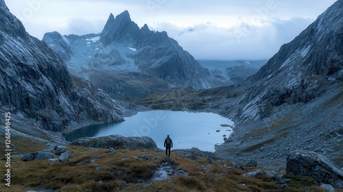 mountain, lake, hiker, landscape, serenity, tranquil, calm, peaceful, nature, outdoors, adventure, exploration, travel, journey, scenic, view, vista, majestic, awe, wonder, breathtaking, dramatic, rugged, rocky, cliff, peak, cloud, sky, blue, grey, cold, misty, fog, solitude, stillness, wilderness, remote, wild, hiking, trekking, path, trail, person, man, walking, alone