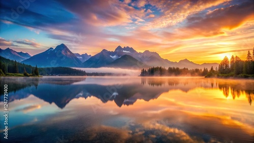Serene Mountain Lake at Sunrise, Reflecting Golden Hues and Misty Peaks