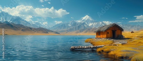 Serene Mountain Lake Cabin Peaceful Asian Landscape