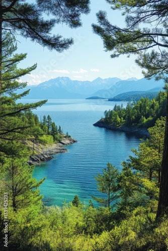 lake, mountain, forest, pine, water, vista, peak, tree, sky, nature, landscape, view, serene, tranquil, blue, green, distant, clear, scenic, summer, wilderness, shore, coastline, rocky, island, foliage, sunlight, horizon, travel, vacation, tour tourism, environment, natural, beauty, calm, peaceful, quiet, fresh, bright, idylli, picturesque, panorama, scenery, evergreen, turquoise