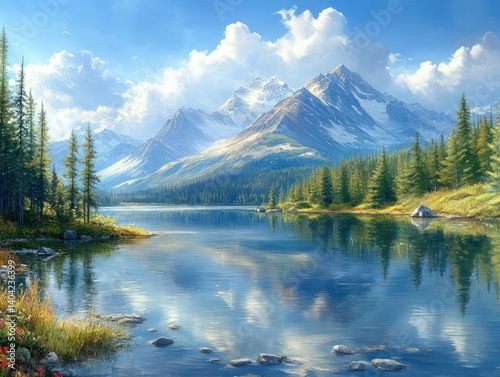 mountain, lake, landscape, nature, scenic, peaceful, serene, water, cloud, sky, tree, forest, mountain, summer, sunny, tranquil, calm, beautiful, vibrant, colourful, pine, hiking, travel, vacation, fishing, camping, photo, digital, art, painting, view, fresh, clear, rock, grass, flora, fauna, wildlife, explore, beauty, amazing, breathtaking