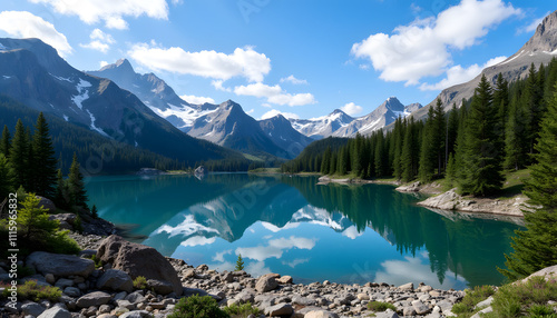 Serene mountain lake reflecting stunning peaks and evergreen trees under a bright blue sky