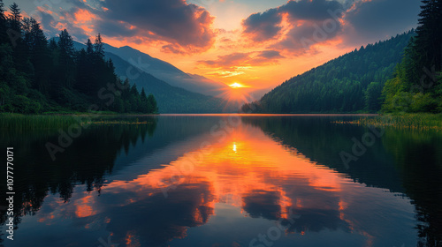 serene mountain lake reflecting stunning sunset with vibrant colors. still water captures beauty of nature, surrounded by lush trees and majestic mountains