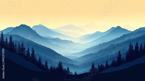 mountain, landscape, nature, scenery, hill, blue, sky, fog, mist, horizon, peak, range, view, panorama, pine, tree, forest, timberland, coniferous, evergreen, rural, scenic, travel, photo, artwork, art, background, wallpaper, graphic, design, digital, illustration, calm, tranquil, peaceful, serene, beautiful, amazing