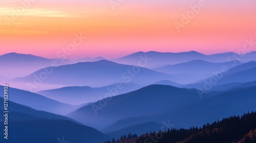 Serene mountain landscape at sunset with layers of misty hills and vibrant sky