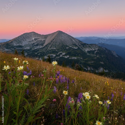 Serene mountain meadow dotted with wildflowers under a pastel pink dawn sky