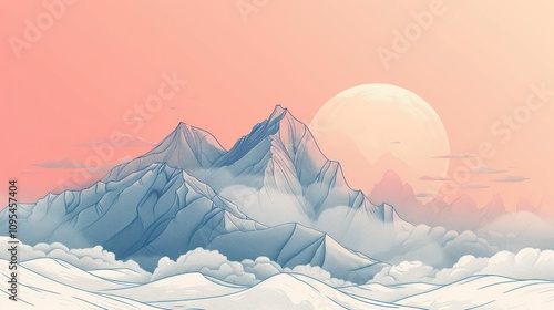 mountain, landscape, sunset, moon, cloud, sky, peak, nature, scenic, view, art, illustration, digital, graphic, design, majestic, serene, peaceful, calm, tranquil, beauty, wonder, awe, inspiring, breathtaking, panoramic, horizon, sunrise, dawn, light, colours, pastel, pink, blue, white, cold, warm, high, elevation, range, rocky, snowy, winter, summer, adventure, travel, exploration, environment